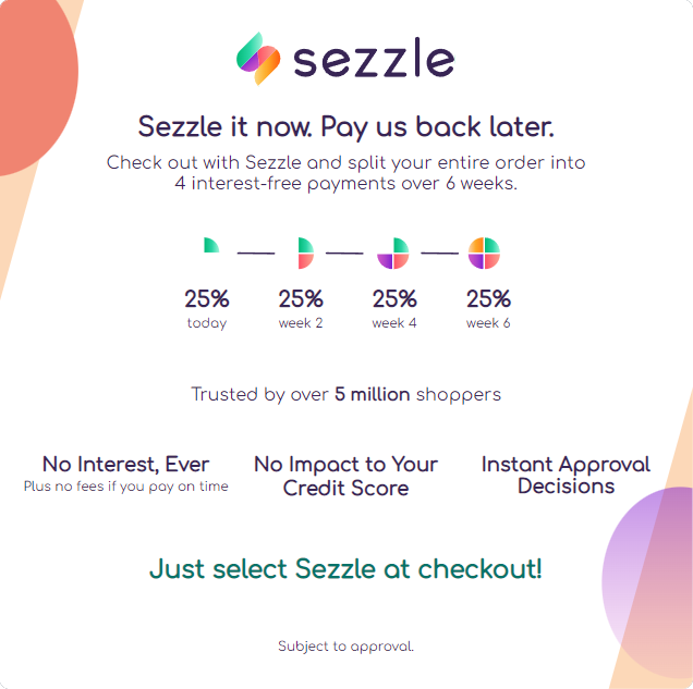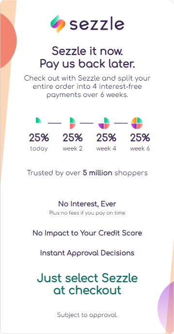 Check out with Sezzle and split your entire order into 4 interest-free payments over 6 weeks.