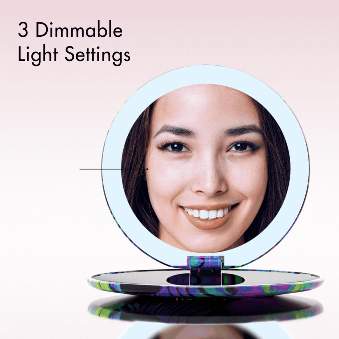 Compact, dual-sided 1x and 10x magnification with three light modes—warm, cool, and daylight.