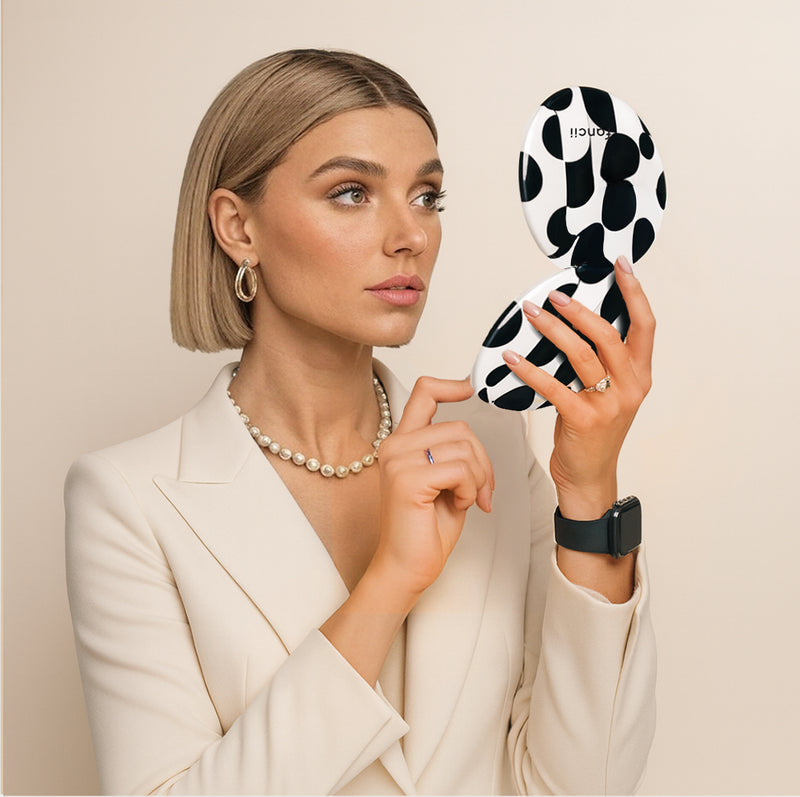Embrace the timeless allure of the "Mello Monochrome" Taylor Compact. Its striking black and white design brings a sophisticated touch to your daily beauty routine.